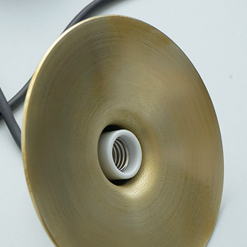・金属の板を伸ばして成形する”ヘラ絞り”という技術を使い、熟練の職人が一点一点手作業で製造しています。ぽってりとした厚さ約3mmの真鍮シェードはフチ部分に丸みを出し、金属なのに不思議と柔らかい空気感を持つシェイプに仕上げました。