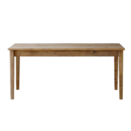 ヴィンテージ調の大きめのダイニングテーブルです。片側にアンティーク調の金物が付いた引出しが2ヶ所あります。古材を活かした加工で、節目や凸凹も1点ずつ異なり、愛着の沸くテーブルです。長手幅が1600mmあるので片側に最大3名ずつ、短ても800mmと大きめなので、場所によりパーティ等では8名でテーブルを囲うこともできそうです。